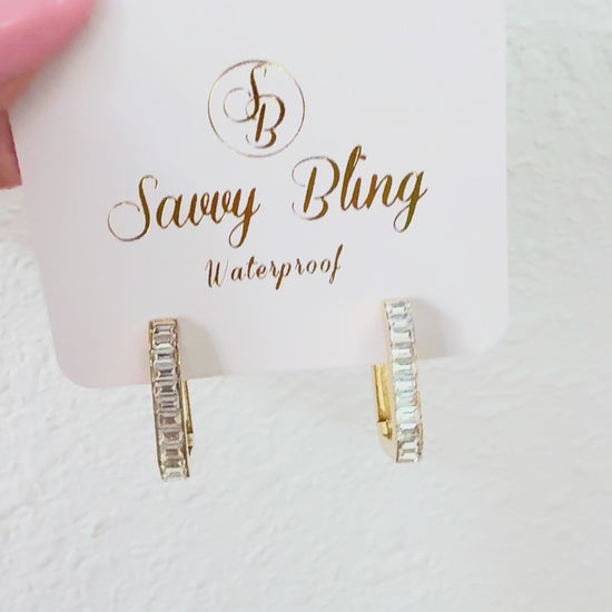 Sleek lines, all the sparkle. The Baguette Frame Huggies feature a modern rectangular hoop silhouette finished with a row of baguette cut CZ stones for a clean, elevated shine. Lightweight with a secure click closure, they’re the perfect everyday statement—polished enough for events and easy enough to wear on repeat.